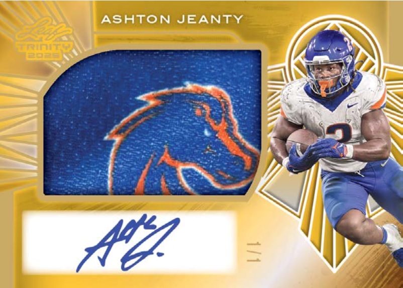 Look for 3 signatures from the following names in each case: Ashton Jeanty, Bryce Underwood, DJ Lagway, Jeremiyah Love, LaNorris Sellers, Omarion Hampton, Sam Leavitt, Barry Sanders, Emmitt Smith, John Elway, Randy Moss, Patrick Mahomes, and Roger Staubach. Look for at least 3 multi-signed cards in every case. Look for HOBBY ONLY (1 per box) Metal Autograph Memorabilia Cards.