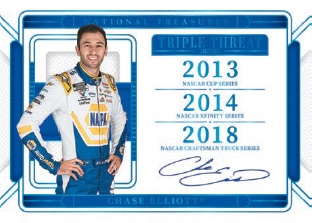 Look for Base 2016 Throwback cards that replicate the first National Treasures Racing release! Hunt for Rookie Signatures featuring highly touted prospects Connor Zilisch and Brent Crews! Search for new sets including Net Gain, Triple Threat Signers and Rookie of the Year Autographs. Chase the Jeff Gordon Dual Jumbo Patch Autograph Booklet featuring the firesuit from Jeff Gordon's final win!