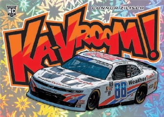 Debuting in the NASCAR product line, Turn Four arrives with a fast-paced release! Kaboom! gets the NASCAR treatment with the brand-new Ka-Vroom! SSP insert! Look for special memorabilia cards featuring pieces of unique materials like pit wall banners, driver gloves and shoes!