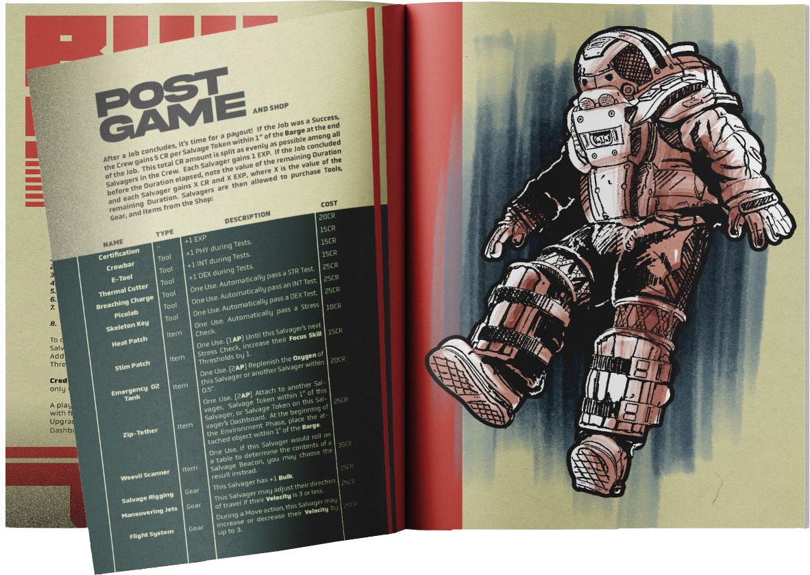 Void Cowboys is a cooperative miniatures game of salvage hunting in deep space for one or more players. Each participant in a game of Void Cowboys is responsible for a Salvager, a singular roughneck worker that floats through the black in search of fortune. Together with other players, your collective salvagers will form a Crew, and take on salvage contracts big and small in search of their next big score.