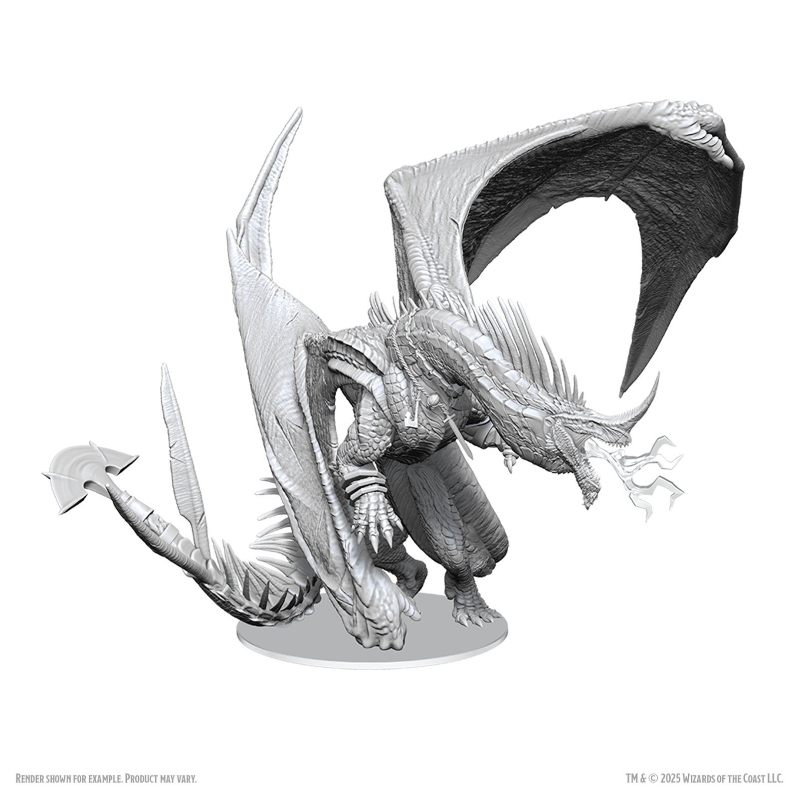 Swoop down on your gaming table with a terrifying ancient blue dragon, featuring a unique, fearsome weapon grafted to its tail. The ancient blue dragon stands 8 inches tall on top of a 100mm clear base. This impressive dragon comes pre-primed with deep sculpting cuts for easy painting. D&D Nolzur's Marvelous Miniatures: Ancient Blue Dragon includes a removable lightning breath weapon.