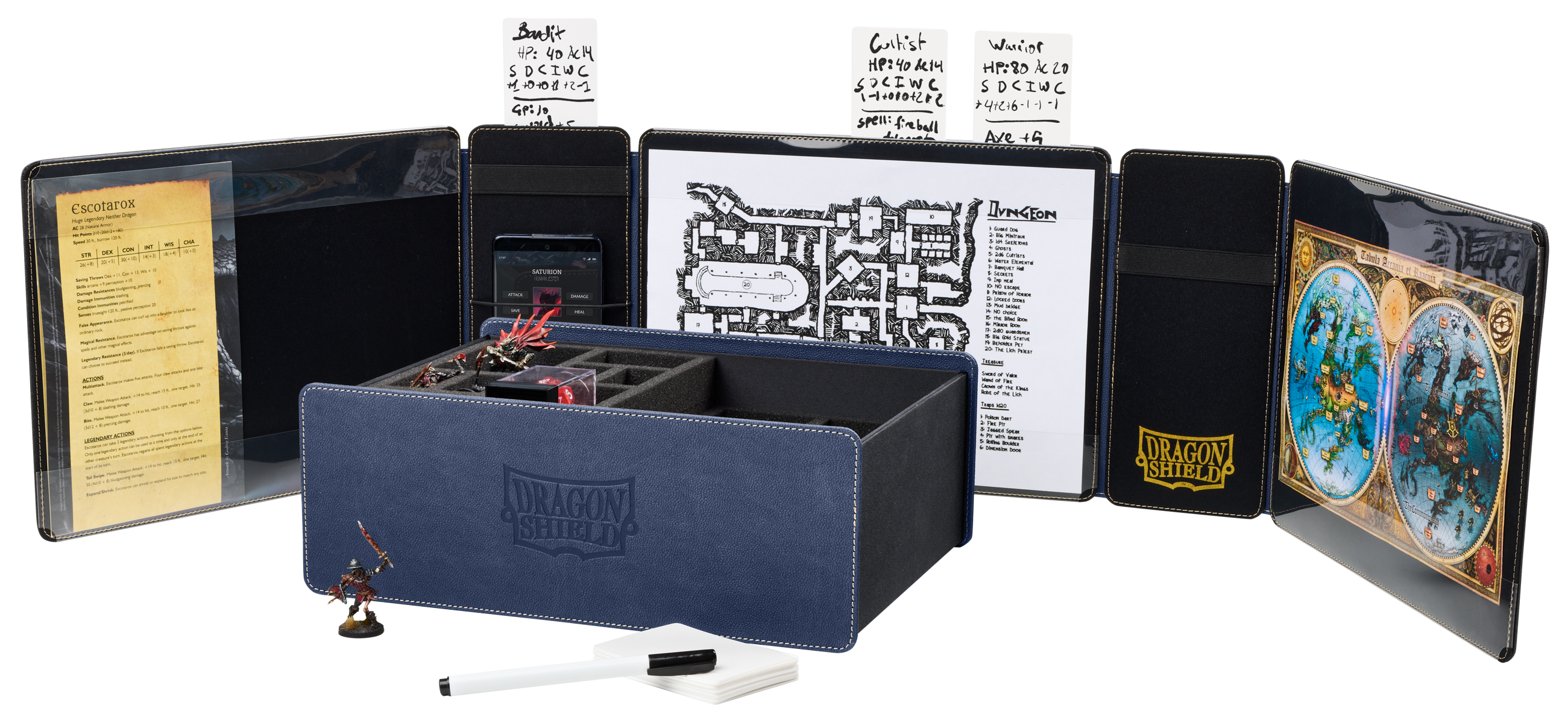 Dragon Shield mini-adventure. Carrying strap with handle Features: Highly customizable and unique all-in-one product. Strong, magnetic closure ensures safe transport and storage of contents. Built-in initiative tracker along the top of the game master screen. Tough Dragon Skin exterior18 reusable plastic cards and dry erase marker included.