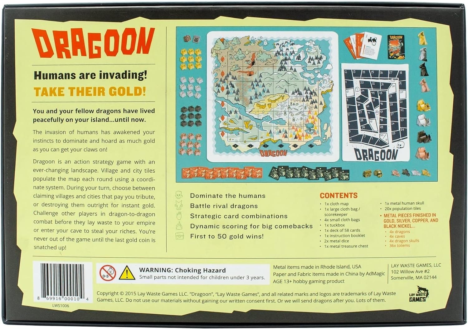 Dragoon is an action strategy game with an ever-changing landscape. Village and city tiles populate the map each round using a coordinate system. During your turn, choose between claiming villages and cities that pay you tribute, or destroying them out right for instant gold. Challenge other players in dragon-to-dragon combat before they lay waste to your empire or enter your cave to steal your riches. You’re never out of the game until the last gold coin is snatched up!