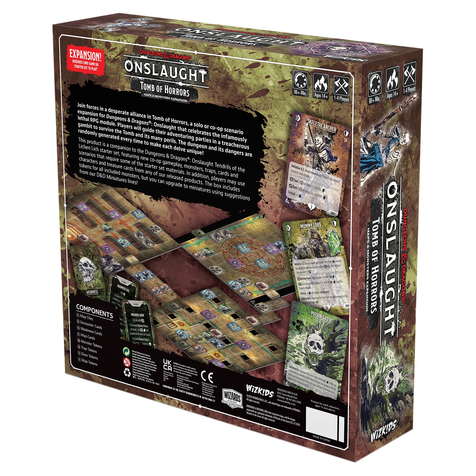 Expansion: Requires the Dungeons & Dragons Onslaught: Tendrils of the Lichen Lich Starter Set, or the original Core Set to Play! In a desperate attempt to survive the infamous Tomb of Horrors and its many perils, you must join forces! In this solo or co-op expansion for Dungeons & Dragons Onslaught, players guide their adventuring parties in a treacherous gambit to make it through the dungeon. The map layout and its dangers are randomly generated each time to make each delve unique. You'll be on the edge of your seat with a variety of lethal monsters and traps you'll need to outlast before conquering the evil demilich! Product Highlights: Experience the renowned Tomb of Horrors adventure module, notorious for its challenging plot with Onslaught gameplay! Every game generates the map and dangers randomly; each delve is a unique experience! Features brand new cooperative gameplay, map tiles, monsters, cards, and scenarios. It's time to team up! Players may use characters and treasure cards from any of the released D&D Onslaught expansions. Players can upgrade the included monster tokens to miniatures using suggestions from our D&D Miniatures lines! Components* 4 Map Tiles, 12 Encounter Cards, 15 Weakness Cards, 8 Map Cards, 26 Monster Tokens, 16 Trap Tokens, 8 Door Tokens, 4 Map Tokens
