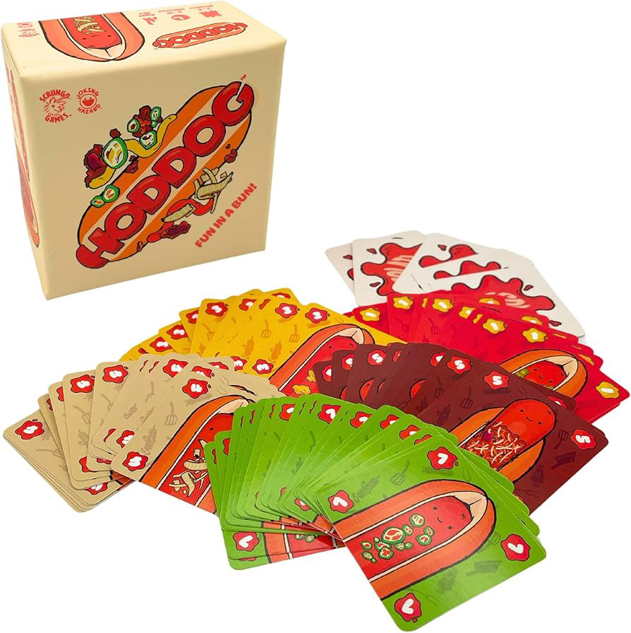 This game includes 78 HODDOG cards and 5 ketchup SPLAT cards, all within a palm-sized box!