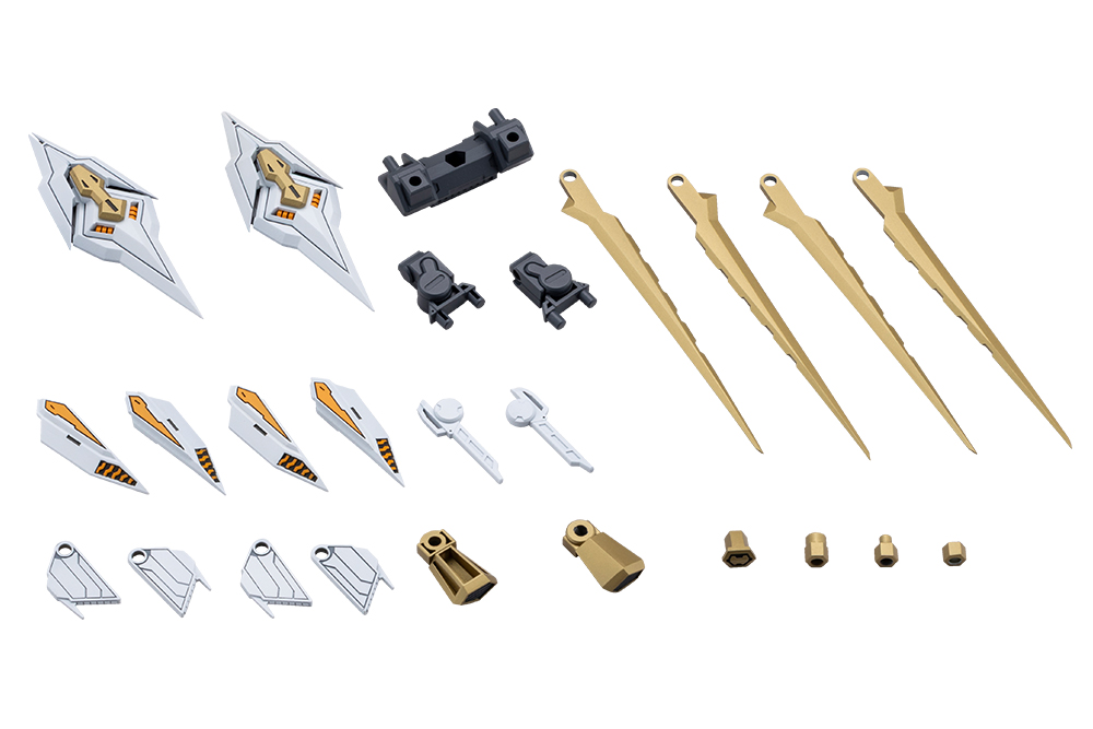 "Witness the power of razor-sharp wings that tear through the sky! An evolution in slashing design!" A powerful, large-scale thruster unit joins the Heavy Weapon Unit lineup. It can be attached to robot or character models and serves as an expansion part that greatly increases customization. Set Specifications: The kit consists of two main components: A backpack unit and wing slash units. The backpack unit is fitted with articulated left and right arms that allow for flexible positioning of the wing slash units. The wing slash units can be reconfigured from the standard Quick Mode into Sharpener Mode by adding blade parts, transforming the silhouette into a more combat-ready style that dramatically changes the look and feel of any model. In Sharpener Mode, the tail blades connect via 3mm connection joints and can be removed for use as customization parts. They can also be attached to the included grips to function as single-edged long swords. The kit is molded in three colors: gray for the backpack unit, white for the wing slash units, and gold for the tail blades. The design was done by sera, well-known for their stylish mecha designs, who was also behind series such as Forme Arms, Stride Rifle, and Customize Blade. Included Items:Backpack Unit x1, Wing Slash Units x2, Tail Blades x4, Single-Edged Long Sword Grips x2