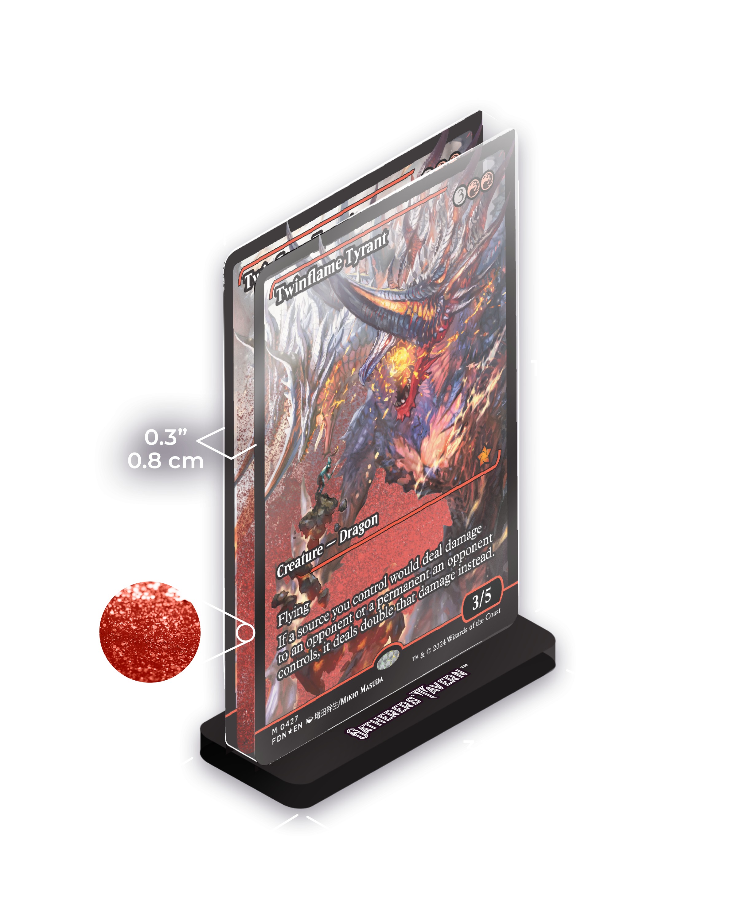 Don't you hate it when the dragon you're hired to fight has two fire-breathing heads instead of one? Featuring Mikio Masuda's blazing Japan showcase art for Foundations, show this Slab standee of Twinflame Tyrant to your contractors to explain why you need to raise your dragon-slaying fee.