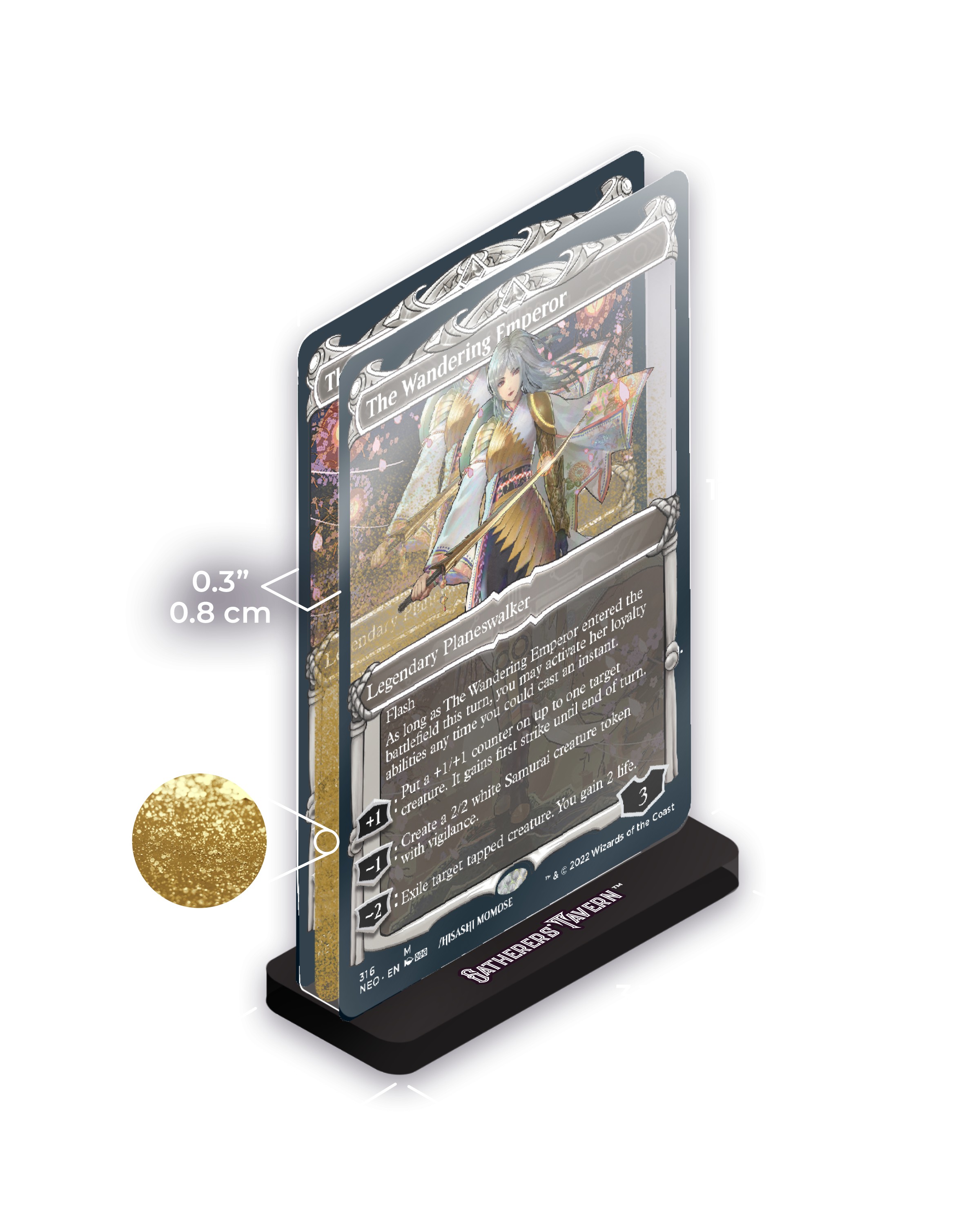 After ten years of traversing the multiverse with an unstable spark, The Wandering Emperor of Kamigawa has finally returned to her home plane. Featuring Hisashi Momose's samurai showcase art for Kamigawa: Neon Dynasty, give this swordswoman's Slab standee a warm welcome into your home