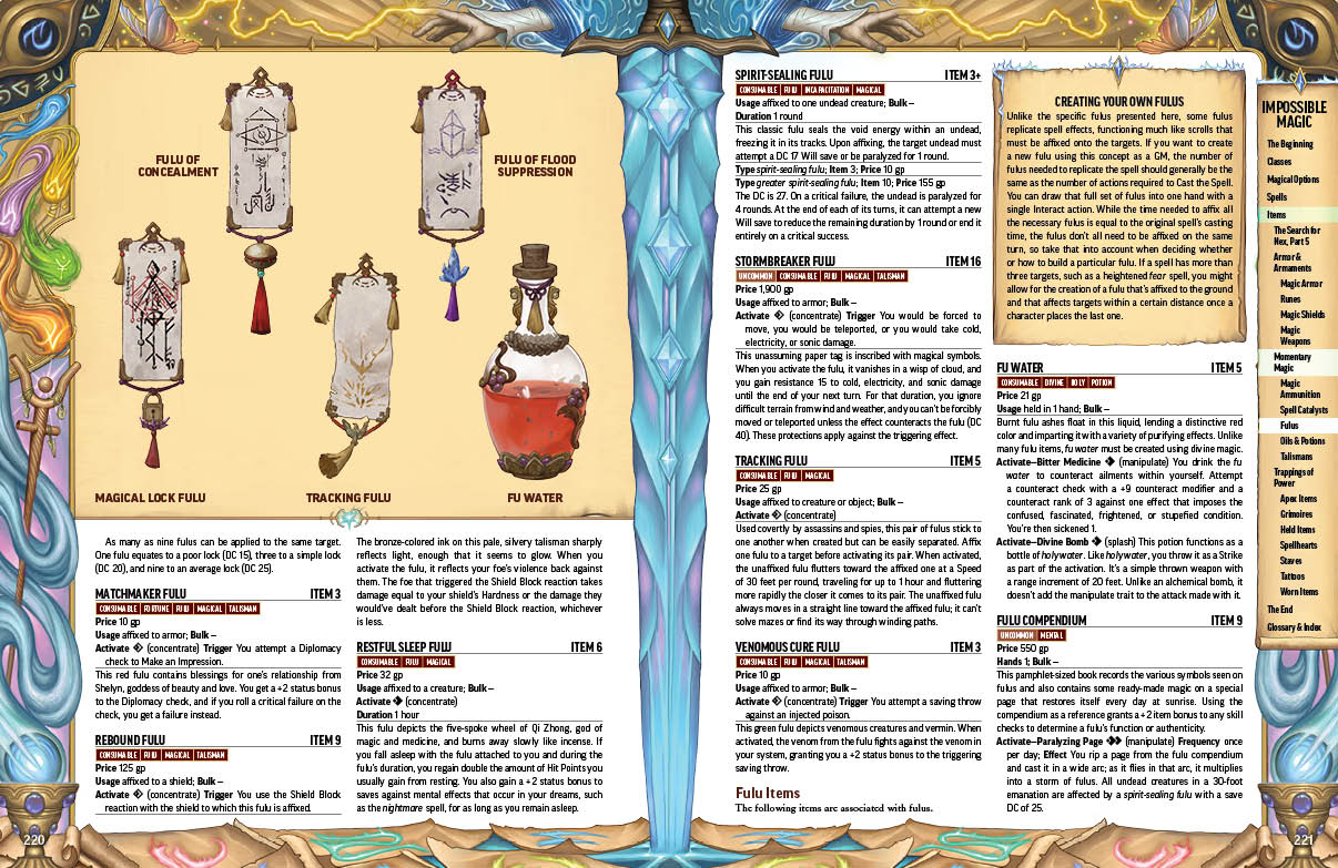 - Fight alongside a powerful magical companion as a summoner.You'll also find over 240 spells that can be cast for both mischief and wonder, new impossible spells so impactful that they scar the soul, several fantastical archetypes that will bring a magical twist to any table, new arcane schools derived from the heart of the Impossible Lands themselves, and wondrous magical items that will allow even the most mundane of characters to experience the power of magic.