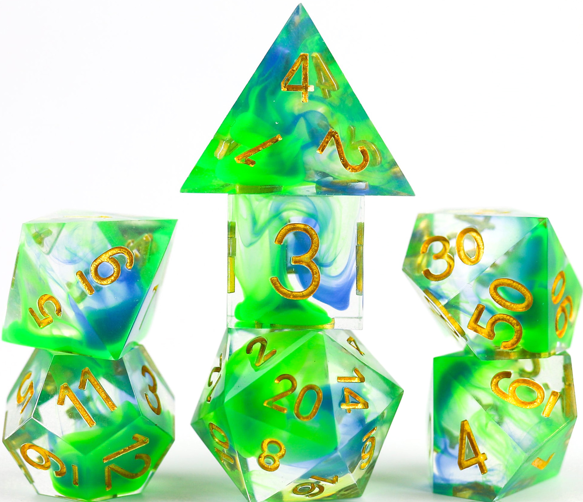 This gorgeous blue and green swirled sharp-edged dice set will brighten your game. Set of 7 polyhedral dice plus 1 extra D20. Packaged in a flat-bottom tube, so you can easily carry and store your nice dice.