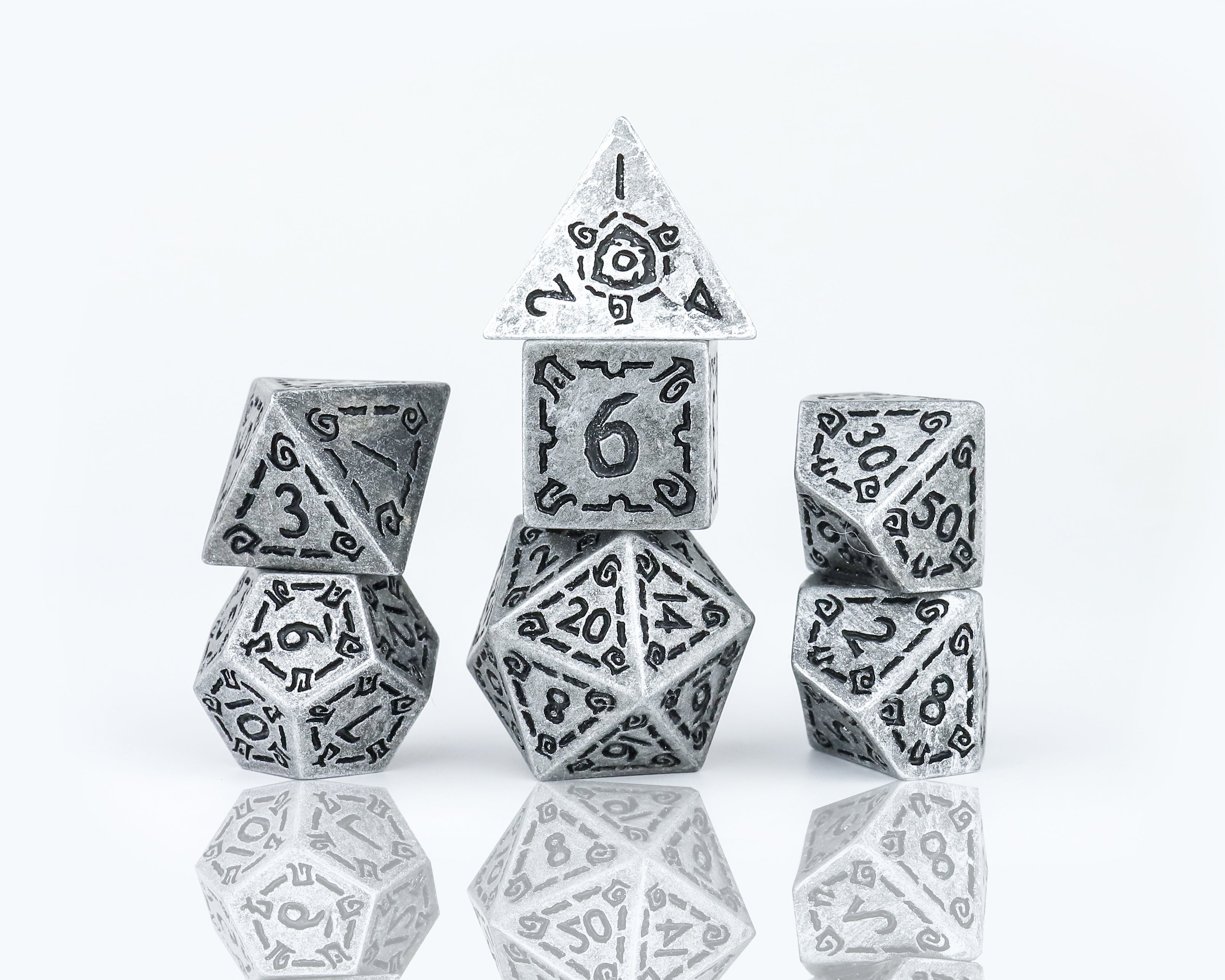 Our Illusory Metal dice look like metal but have the great weight and feel of resin! Each set features glyphs and numbers with a vintage feel. This Silver set features a set of 7 polyhedral dice packaged in a windowed tin, so you can easily carry and store your dice.