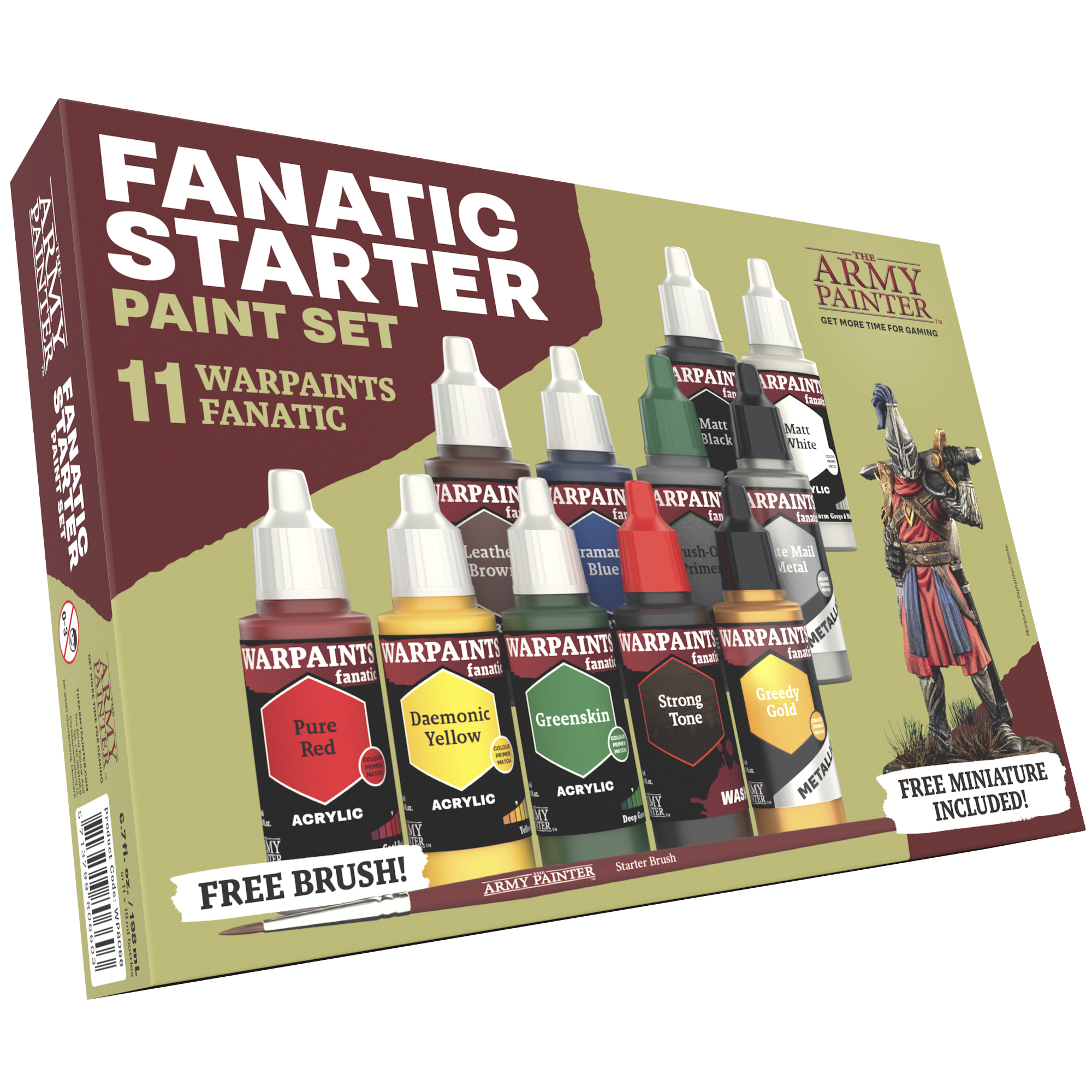 The Warpaints Fanatic Starter Paint Set featuresthe essential colours needed for painting your gaming miniatures and creating beautiful tabletop-quality miniatures in no time - so you Get More Time for Gaming. Inside, you will find 11 paints in total with 7 acrylic colours, 2 Metallic paints, a Wash, and a Brush-On Primer to kick off and start your paint collection. All paint bottles come with two high-grade stainless steel Mixing Balls pre-loaded in the bottle, making it easier for you to get the perfect consistency within a few shakes.