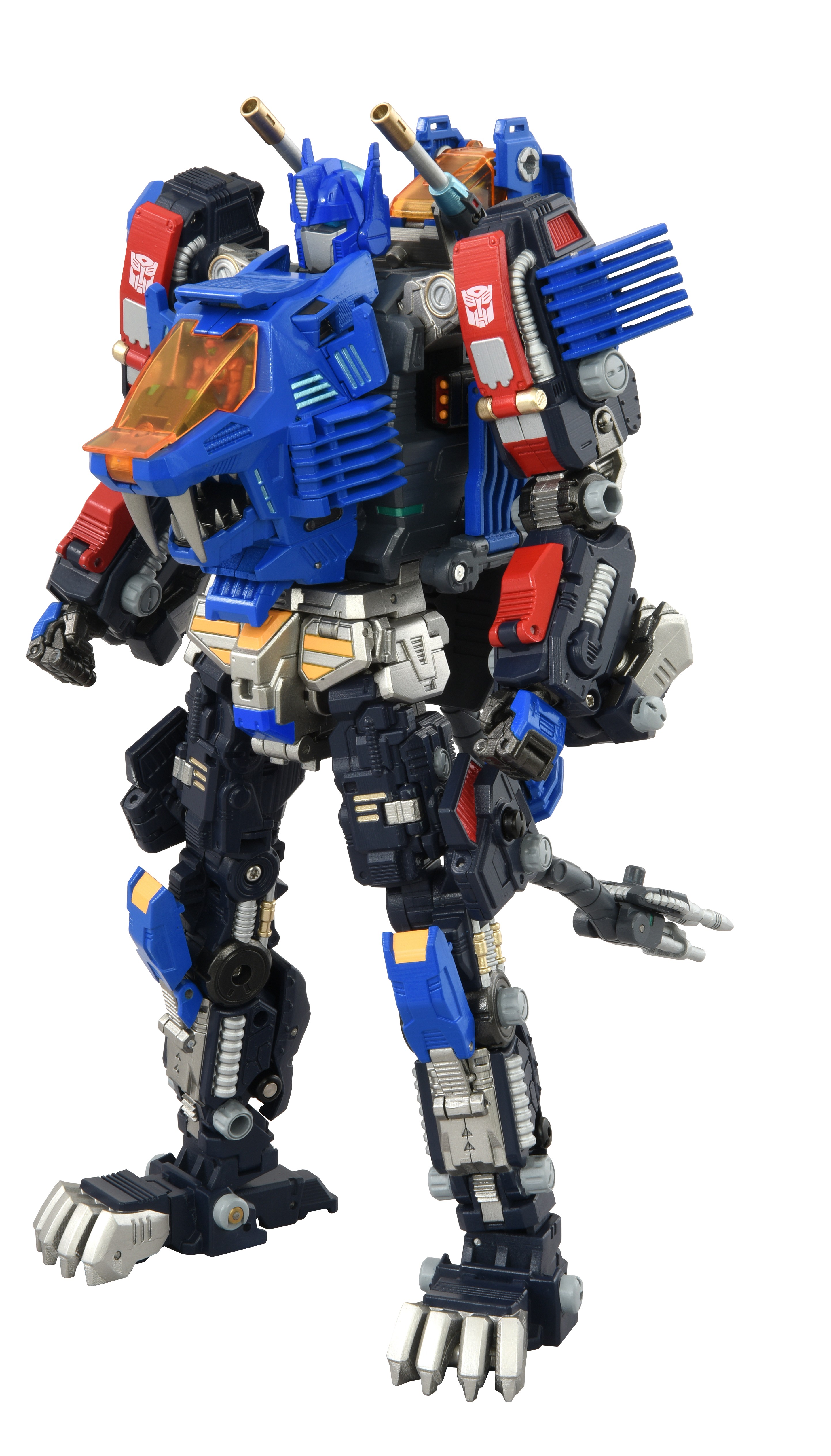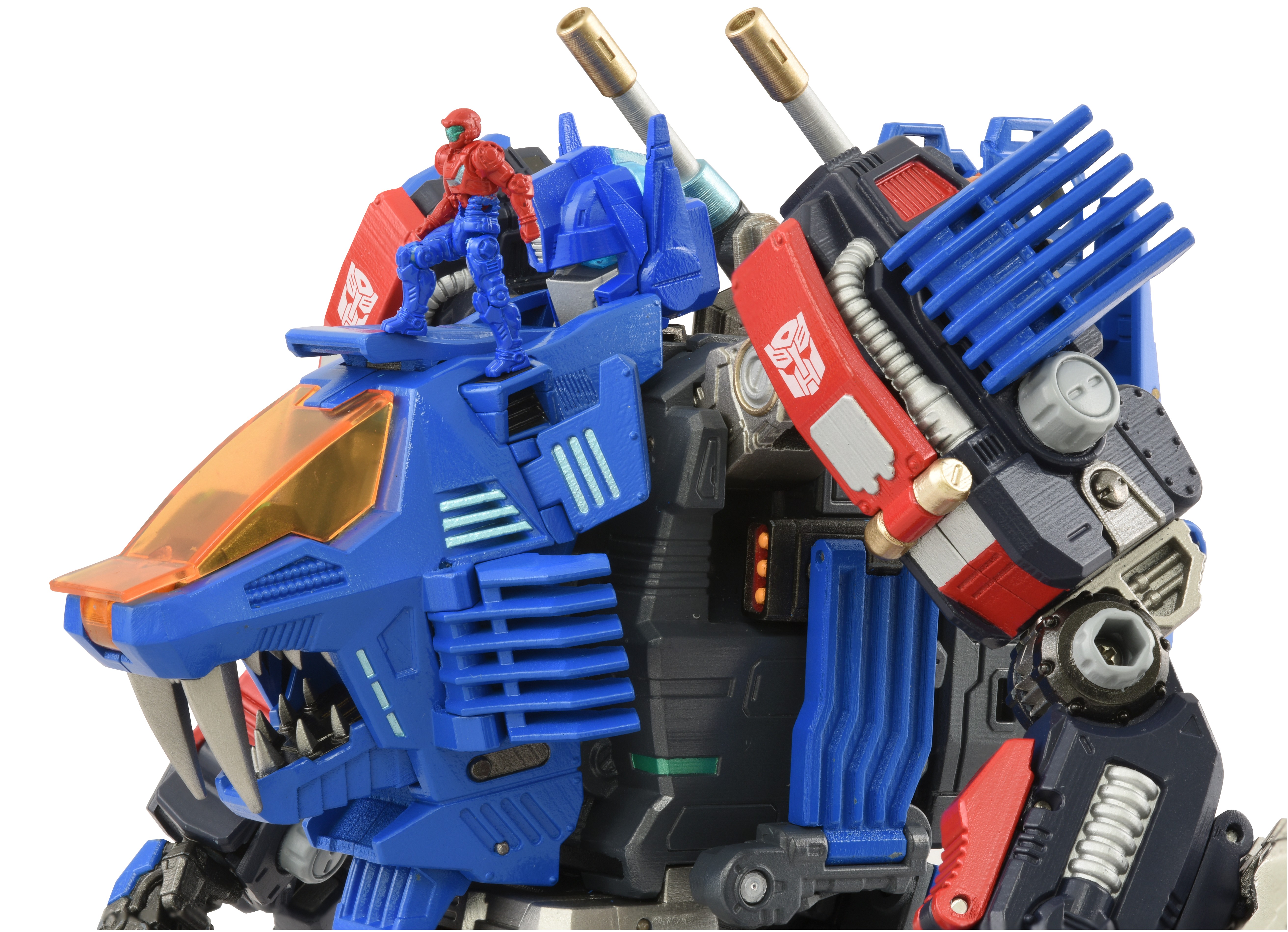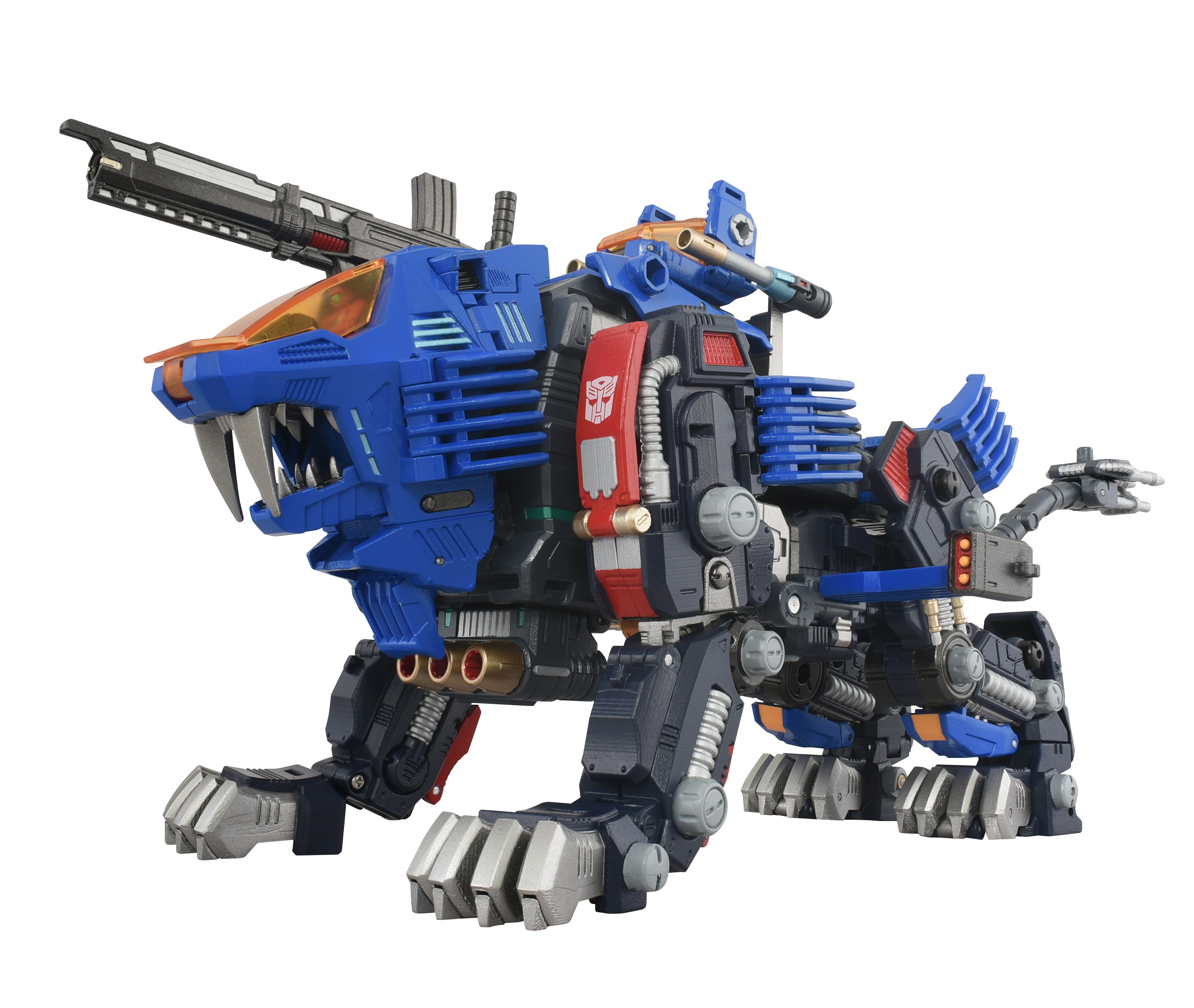 Convert from Optimus Prime robot into Zoids Shield Liger with motorized mouth and light-up cockpit. Set includes attachable weapons like FZ Ion Blaster, Twin FZ Beam, and Triple Impact Cannon as well as Bullet Core vehicle and Road Viper armored bike. Comes with 2 Diaclone Corps figures that can fit in the cockpit and can sit on Road Viper and Bullet Core.