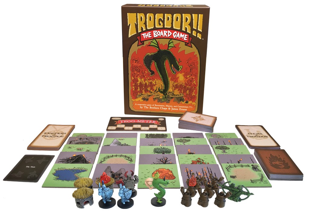 Trogdor!! The Board GameĀ is a cooperative light strategy/area control game of burnination, majesty, and consummate V's for 1-6 players from the Brothers Chaps and James Ernest. Choose to play as one of 9 Keepers of Trogdor, each with their own unique abilities, as you take turns controlling a beefy-armed dragon in his quest to burninate the entire countryside.