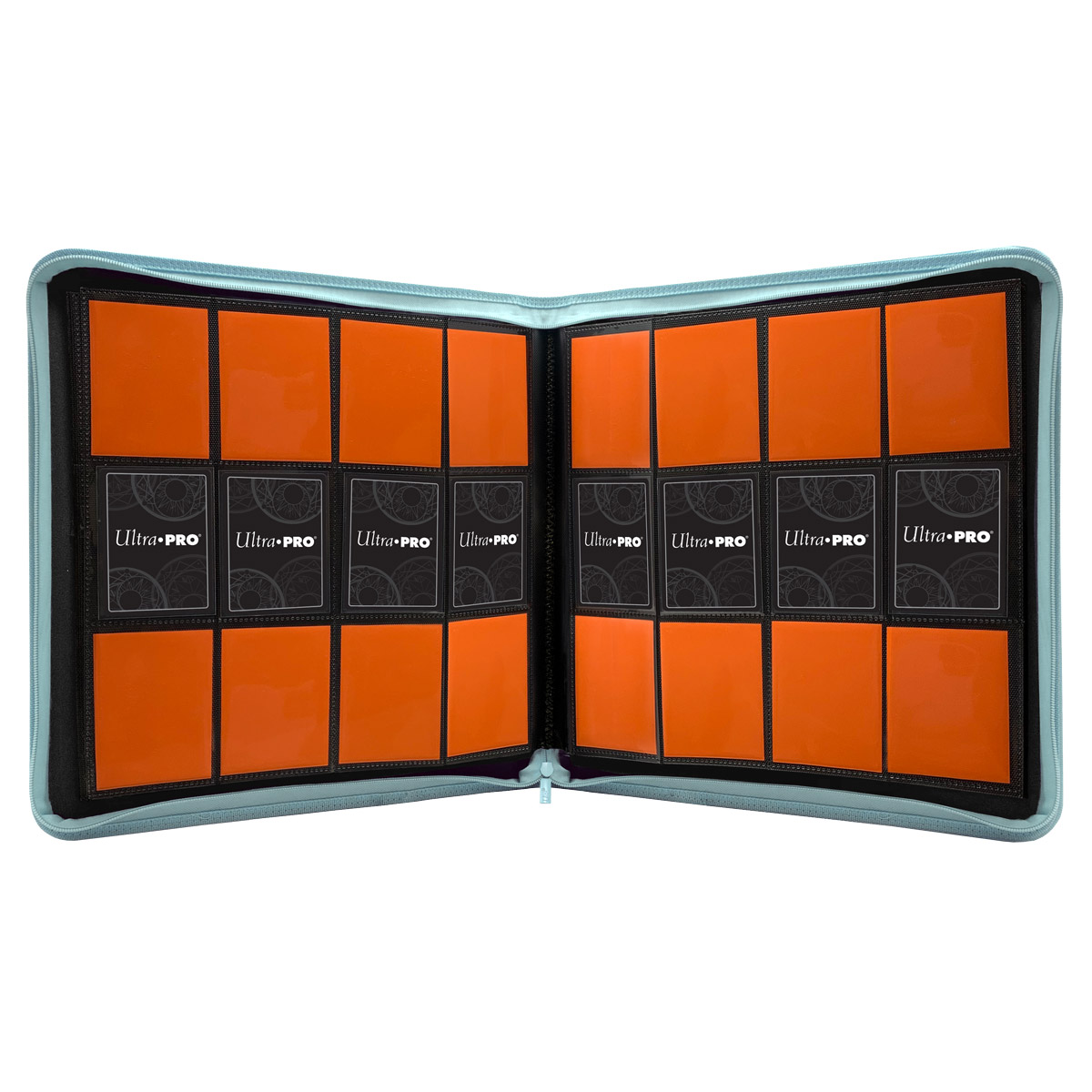 Ultra PROs 12-Pocket Zippered PRO-Binders are designed for collecting and organizing playsets of your favorite trading cards. Each binder features a padded leatherette cover with a zipper closure. After unzipping the binder, youll find twenty 12-pocket pages sized for standard trading cards in side-loading pockets, allowing you to store up to 480 cards in Deck Protector sleeves. Pages feature a low-friction black backing, creating a separation between the front and back pockets, as well as providing cards a classic framed look. Every PRO-Binder is made with acid-free, non-PVC materials to ensure your cards are protected and preserved. The 12-Pocket Playset Premium PRO-Binders are available in 7 colors: Blue, Green, Purple, Red, Light Blue, Yellow, and Teal.