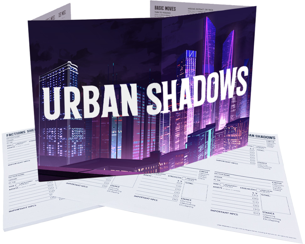 Urban Shadows is an urban fantasy tabletop roleplaying game in which mortals and monsters vie for control of a modern-day city, a political battleground layered just under the reality we think we know. Vampires, faeries, hunters, and wizards fight to carve out a piece of the streets and skyscrapers, ready to make deals with all those who have something to offer. This accessory for Urban Shadows contains both a 4-panel Master of Ceremonies Screen - featuring tools, tables, and information for running the game on the back and full-color art on the front - and a Campaign Notepad with 50 double-sided pull-off sheets to help you track your campaign and the NPCs who inhabit your city. Both of these tools condense and refine the material available in standard play materials to make running the game easy!