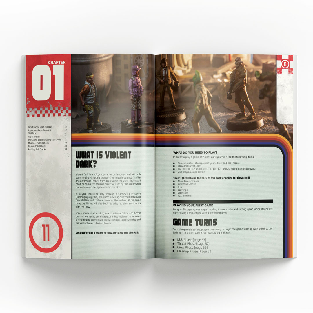 How does Violent Dark play? Violent Dark plays over a number of turns set by the Mission being played. Each turn, players will run through the I.S.S. Phase, Threat Phase, and finally the Crew Phase. As Crew activate they will have two Action Points to spend. Skill Checks set a specific TN that needs to be met or exceeded by a relevant skill die. Skill dice in Violent Dark are represented by different polyhedral dice from D6 to D12. In addition to modifiers to the die roll, the type of die used can also be changed as different situations unfold on the tabletop.