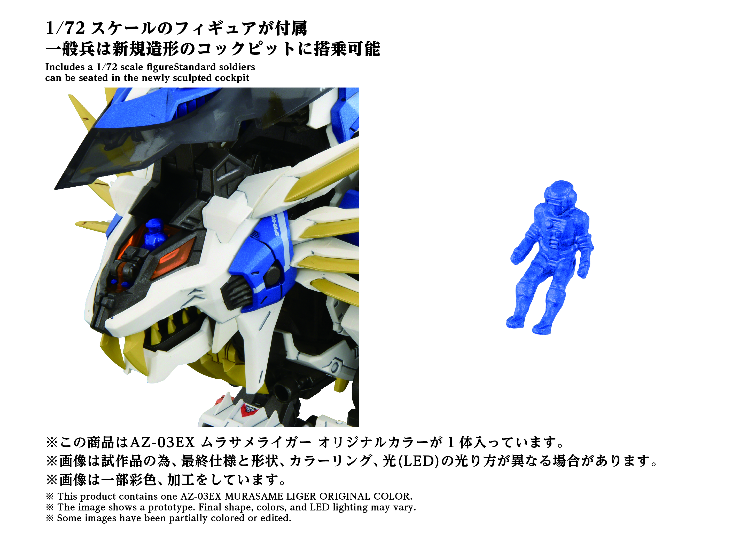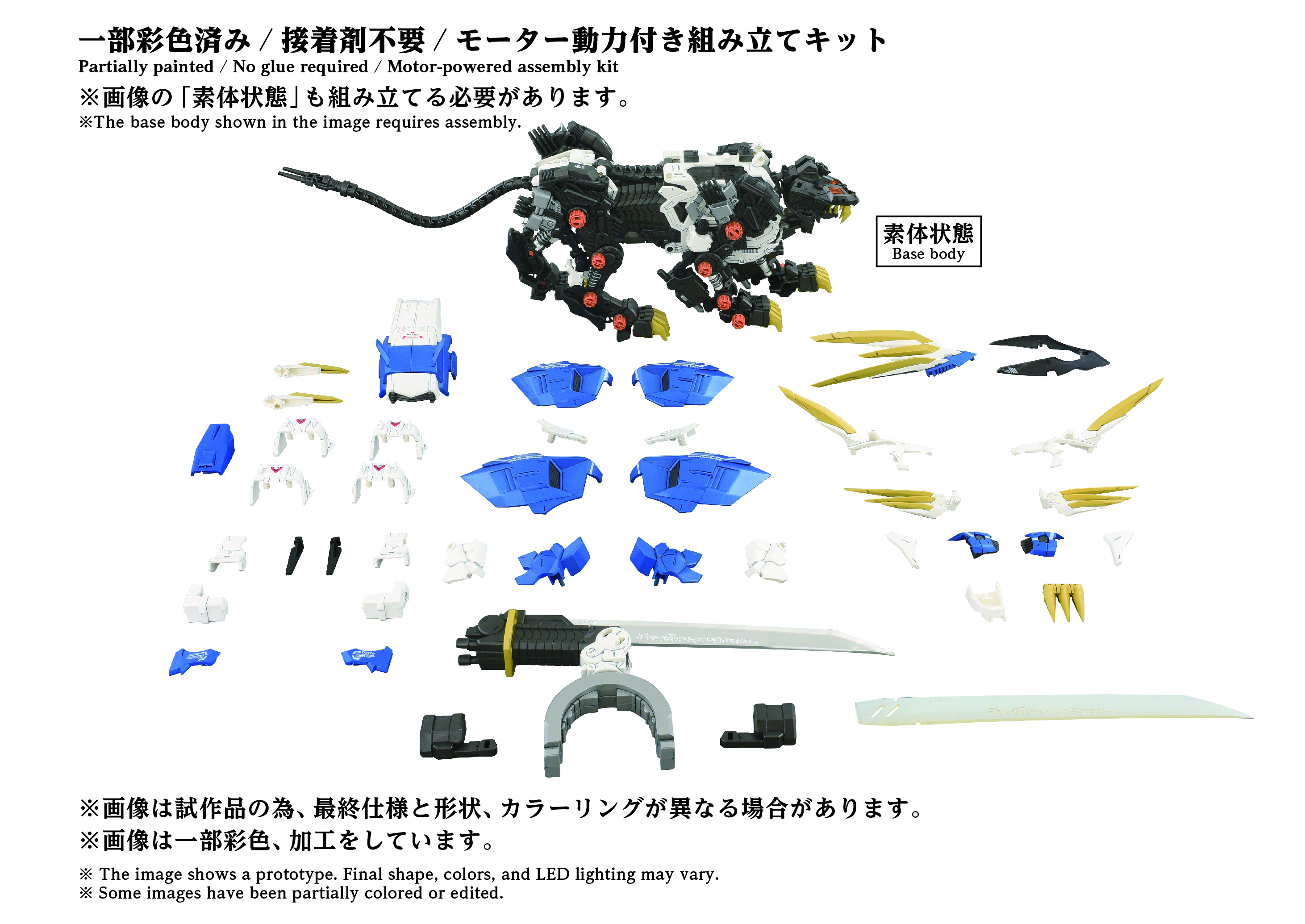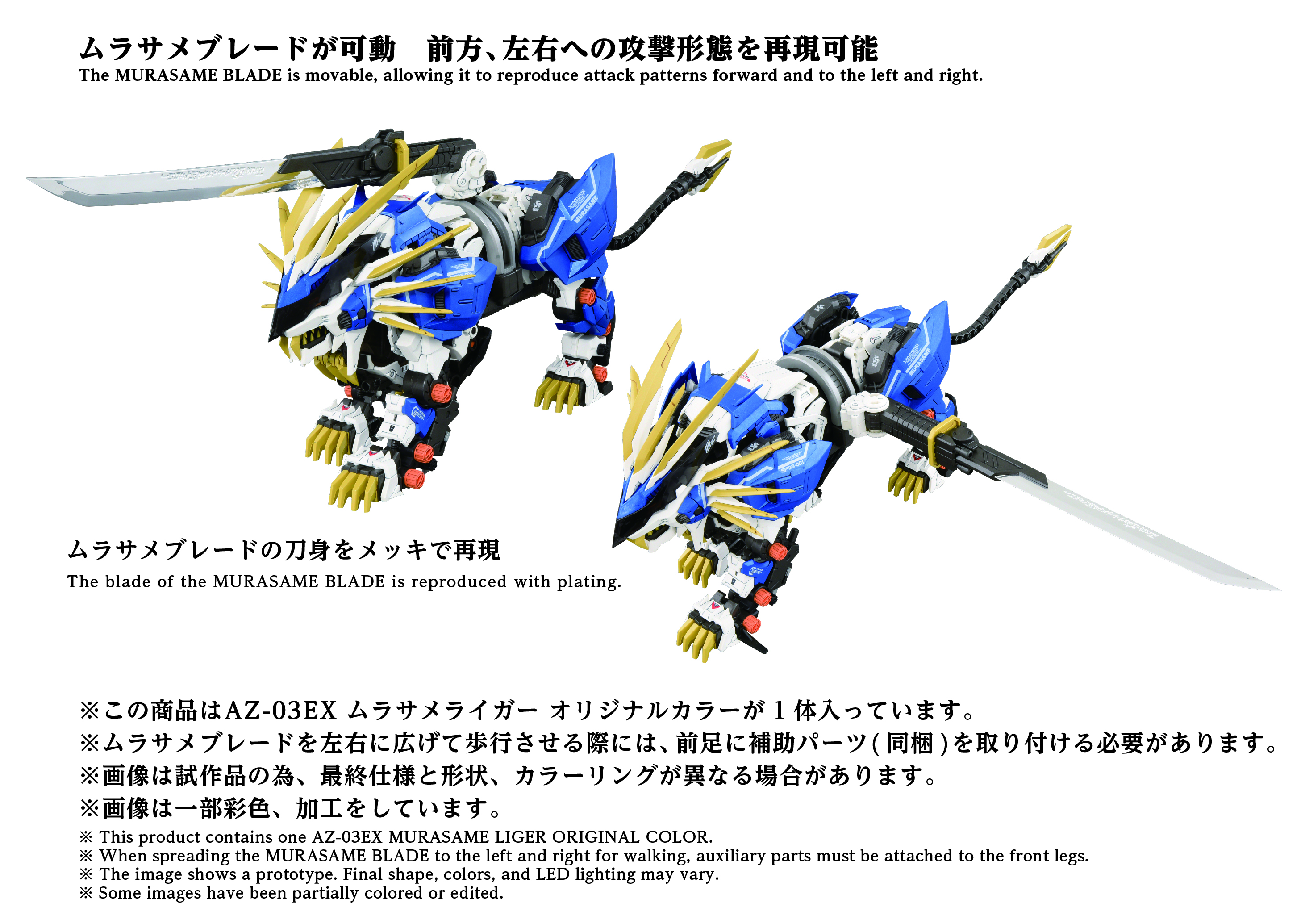 [ADVANCED Zi]Moving Kit Series ADVANCEDIt represents a step toward further evolution, the advancement of common sense. The pinnacle brand embodying the ultimate form of Moving Kits, incorporating "reconstruction," "refinement," and "honing" based on themes set for each Zoids.A 1/72 scale assembly kit. Activating the electric unit recreates realistic animal gait, with LED illumination in the eyes and chest. Parts like the pile bunker are manually movable. The Murasame Blade, the Murasame Liger's ultimate weapon, comes with both a plated version and a phosphorescent version for interchangeable use. The Murasame Blade freely moves forward, backward, left, and right. Its base features an extendable mechanism, further expanding posing possibilities. Includes a 1/72 scale pilot figure (enlisted soldier) that can be seated in the cockpit (unpainted). Mounting it on the included base allows you to enjoy its walking action right there.*Requires AAA Alkaline Batteries X 2 (sold separately)
